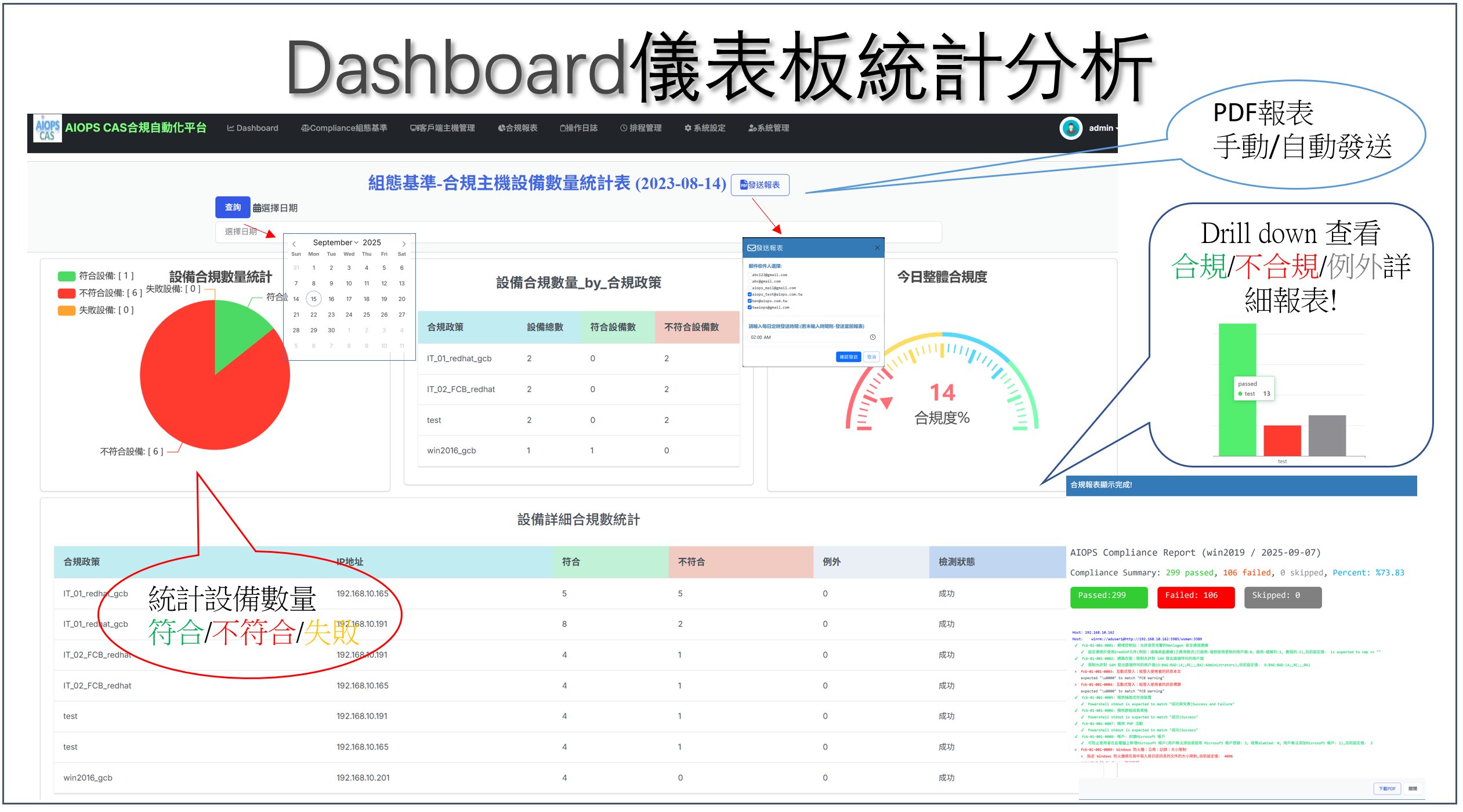 提供組態合規檢核、修正、備份及還原之基礎架構,合規儀表板可查看整體資料中心所有伺服器合規情況,並自動發送報表。
