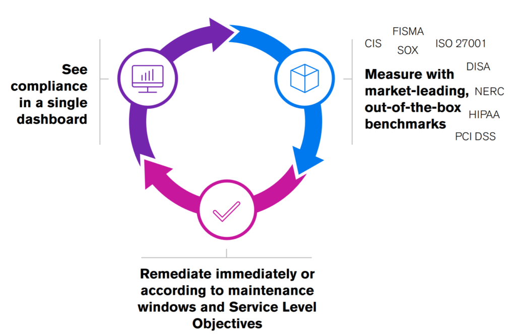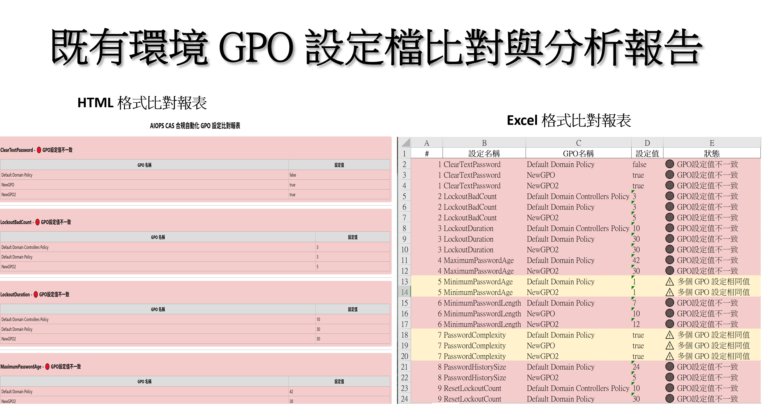 專為 GCB、FCB、CIS、SOX、PCI、HIPPA 等更多政策設計的創新內容。 自動修補不符合資源並可提供中文合規稽核報告。