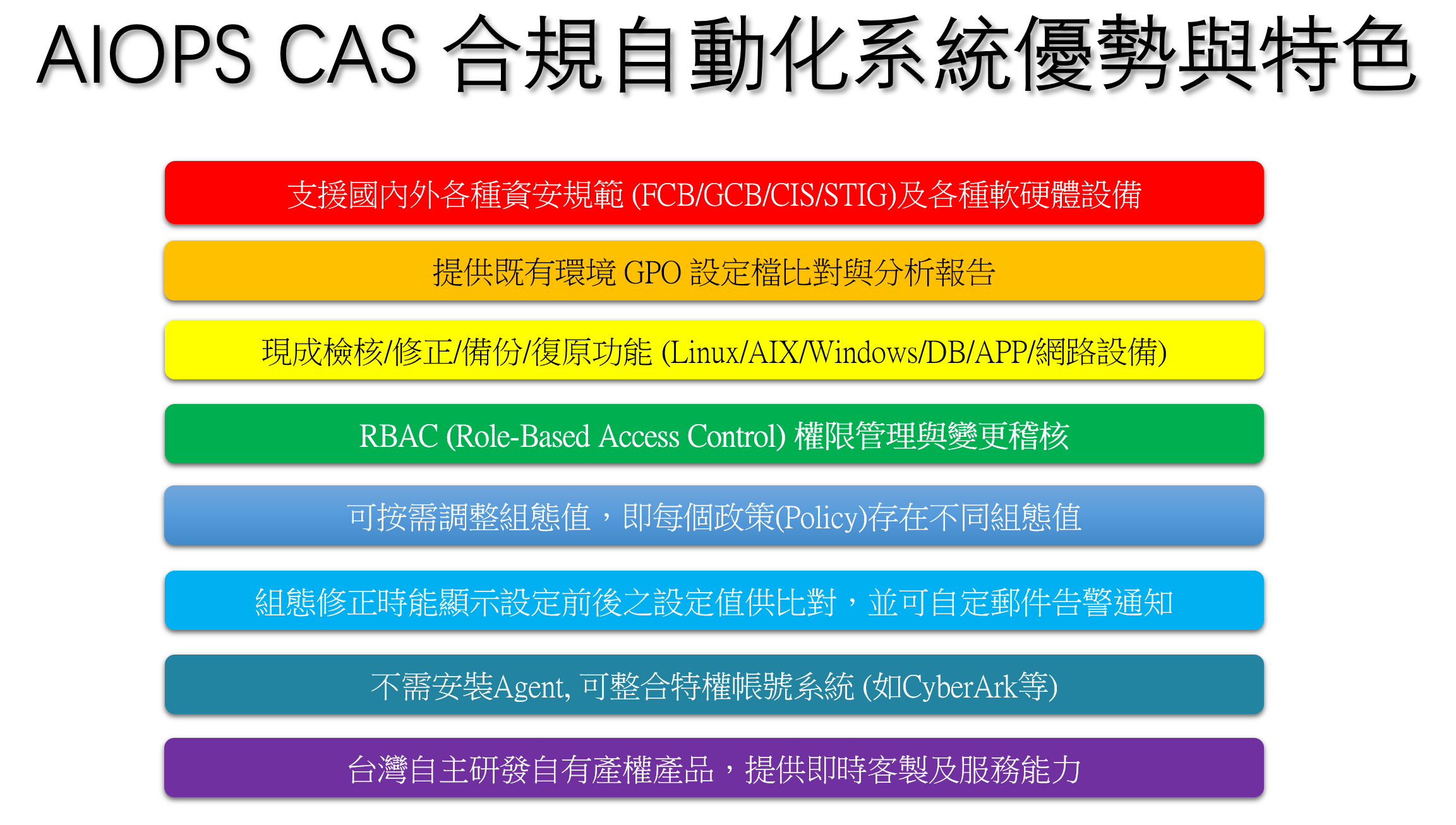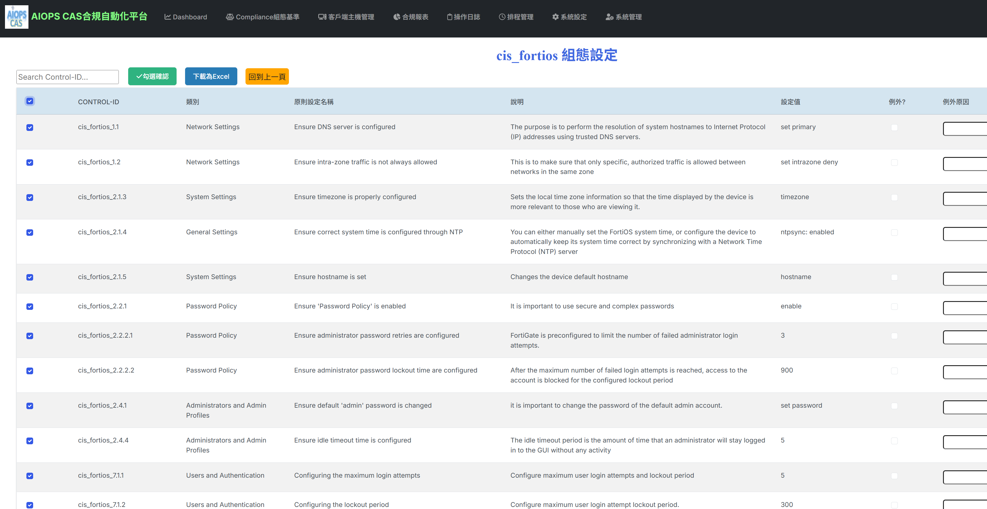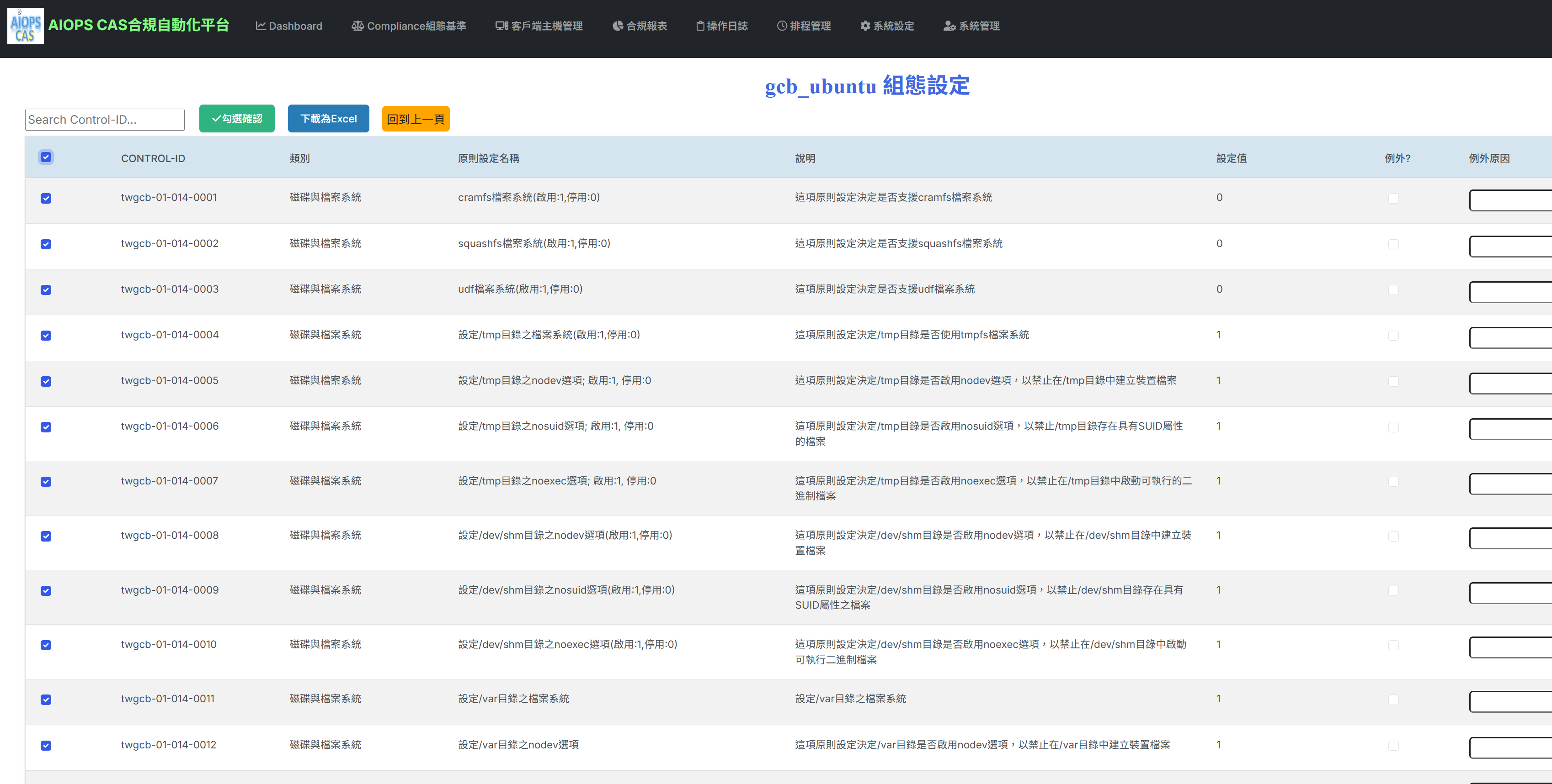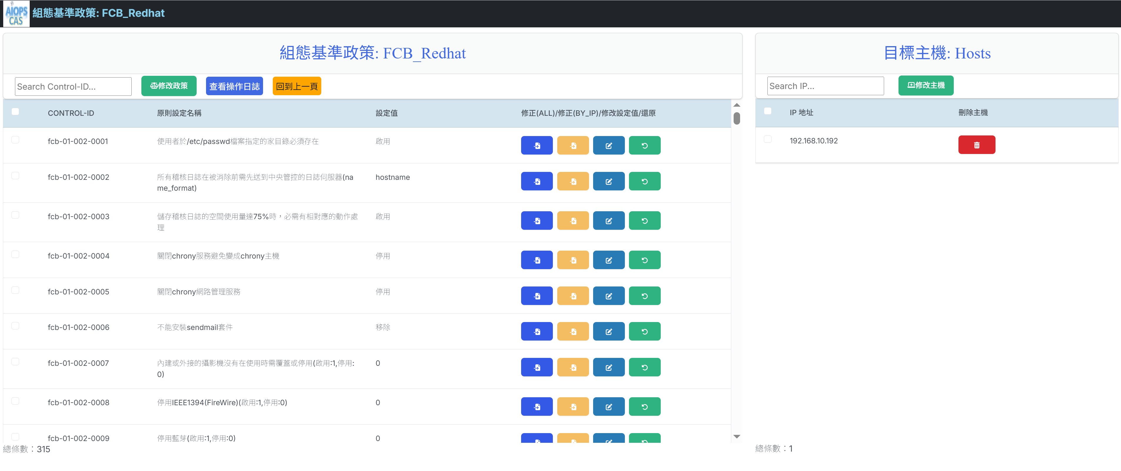 AIOPS CAS 合規自動化系統,提供全系統平台組態設定檢核與修正套用功能。