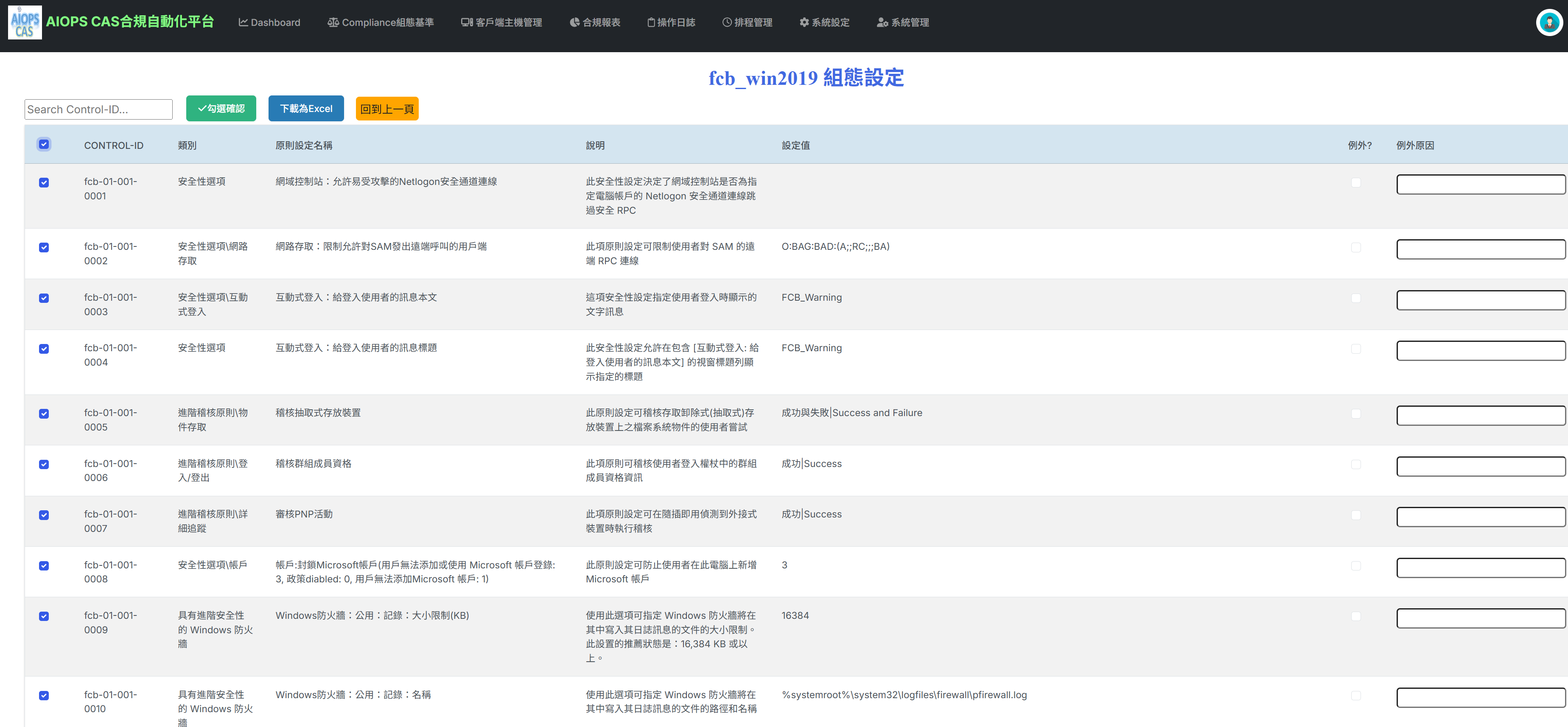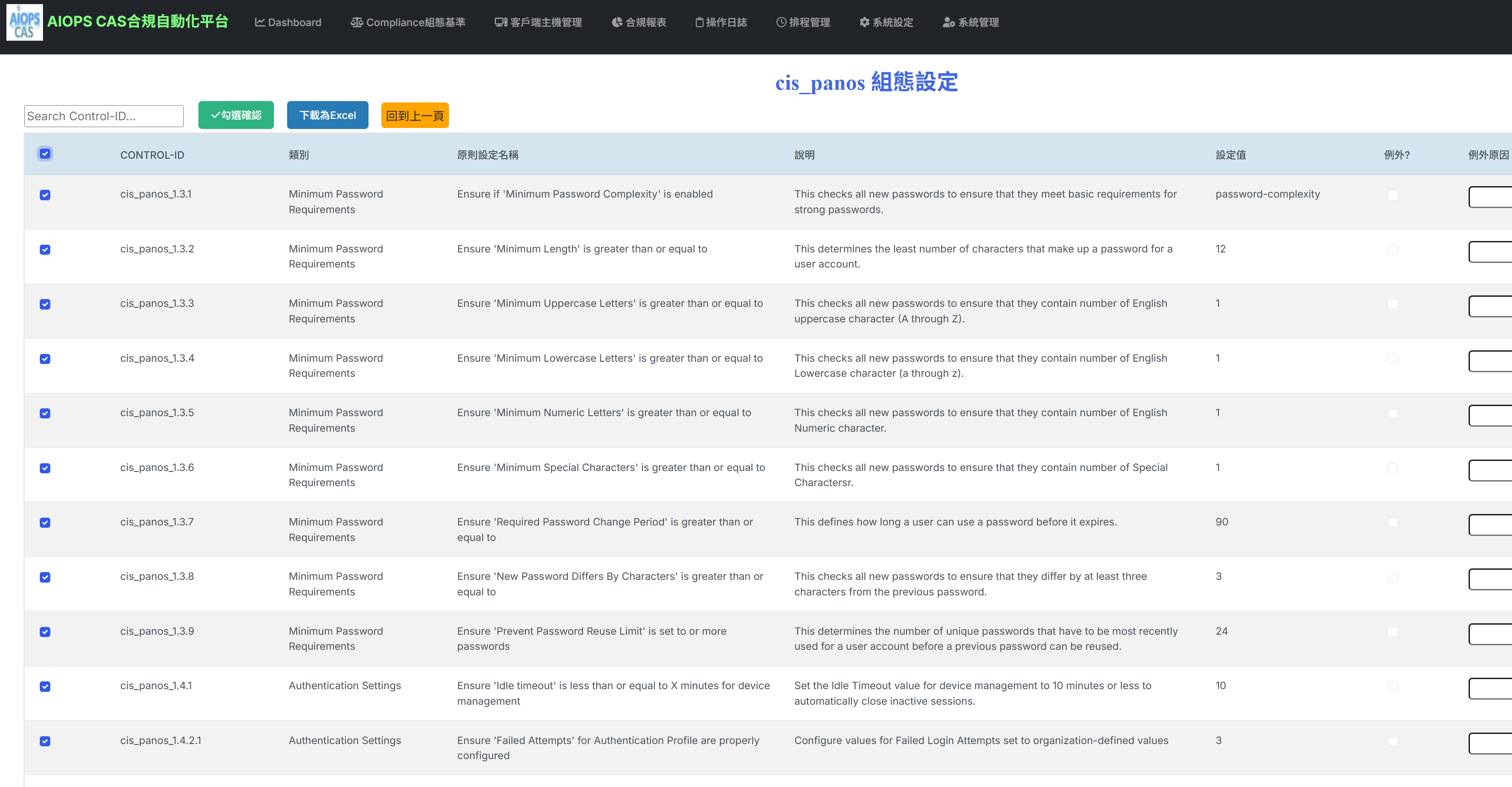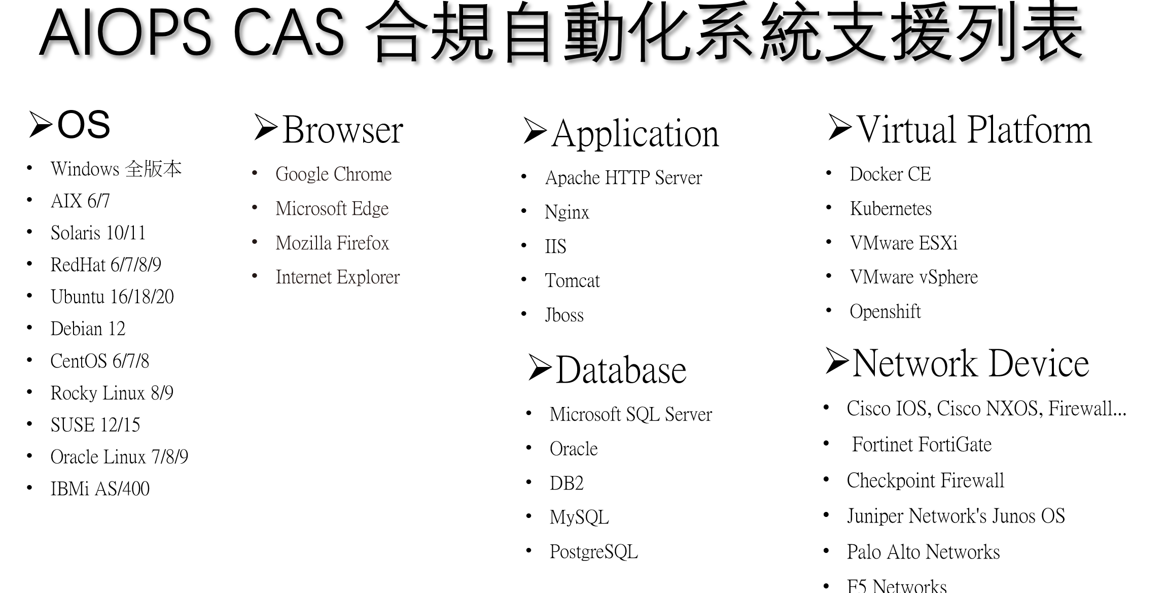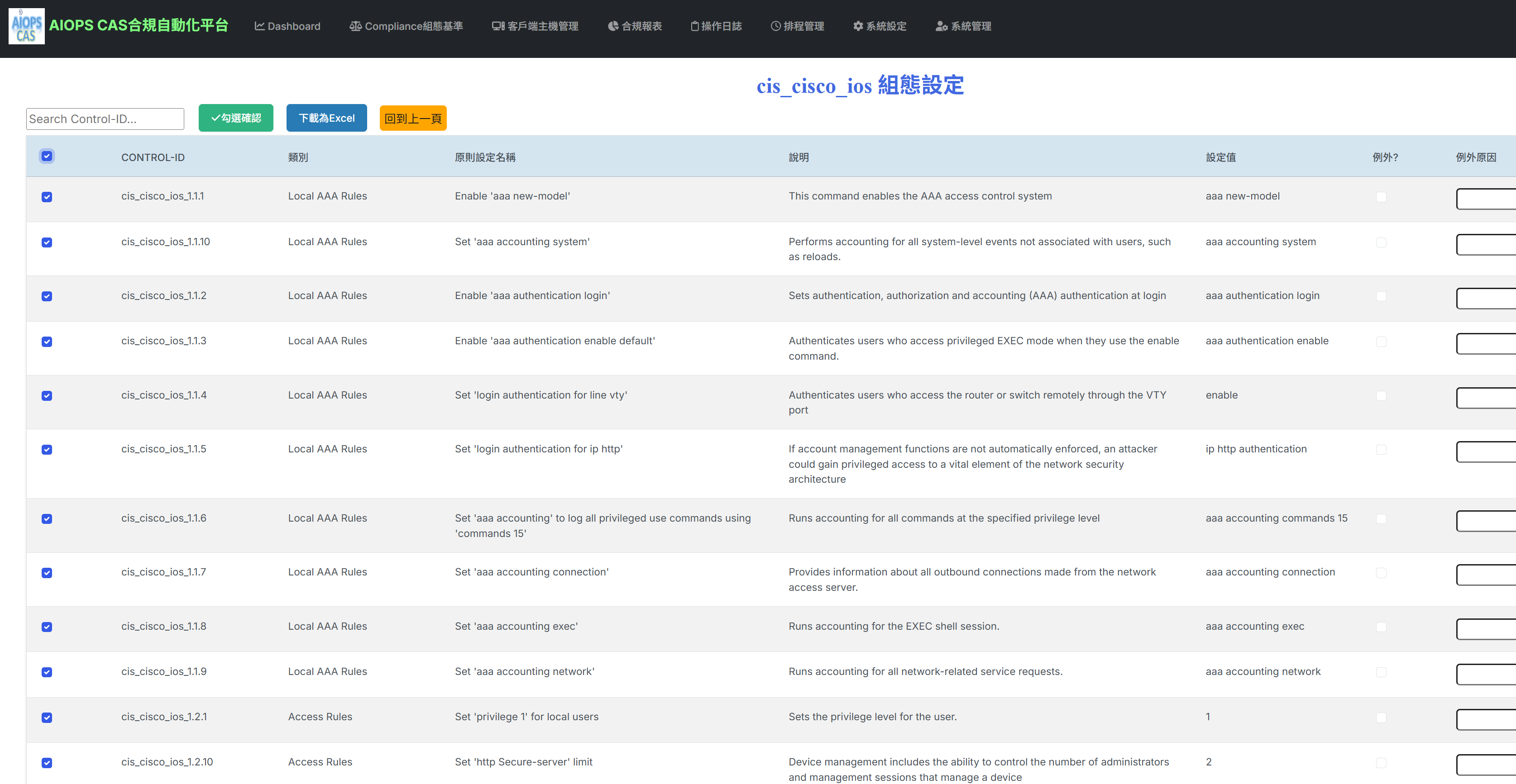 AIOPS CAS 合規自動化系統,提供全系統平台組態設定檢核與修正套用功能。