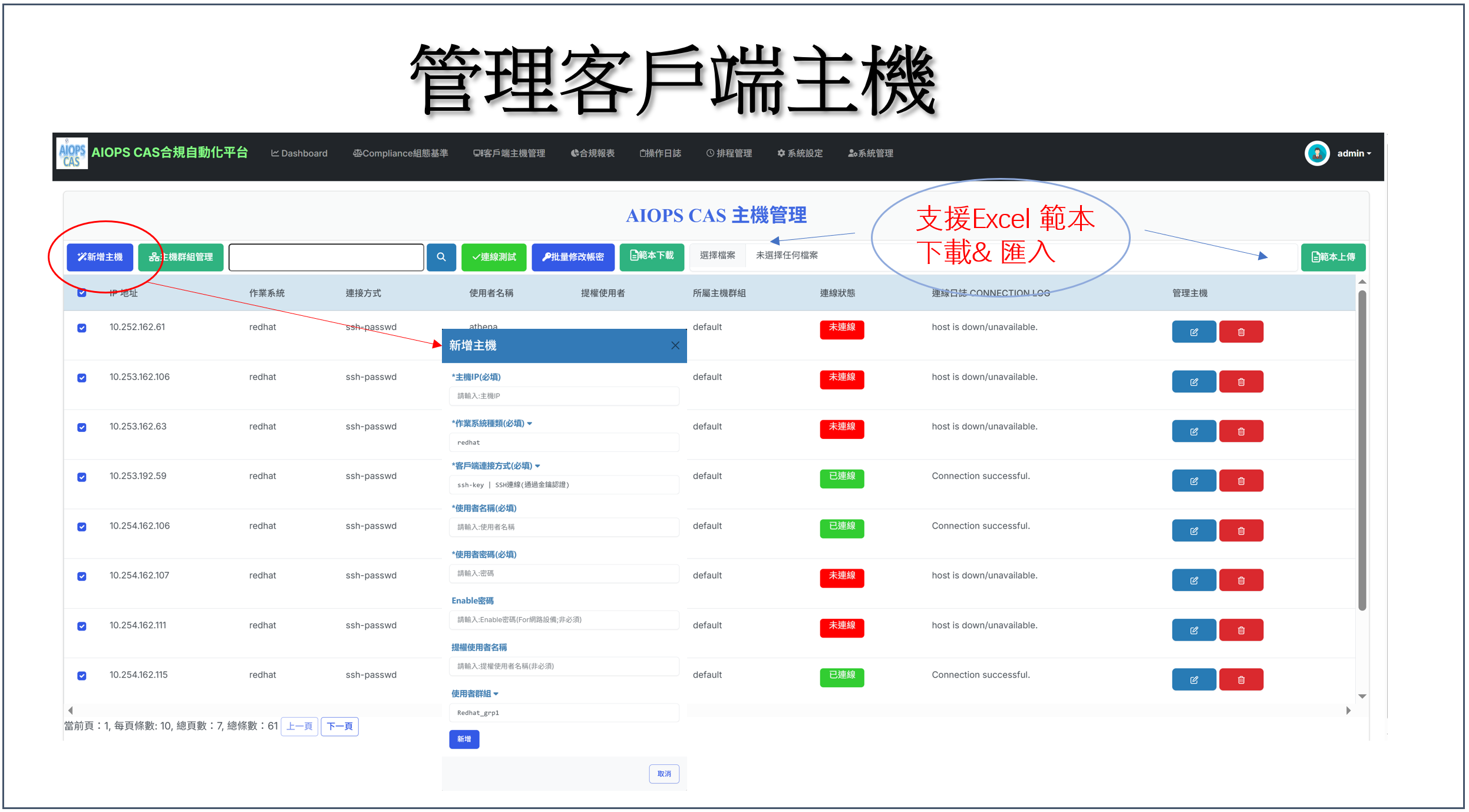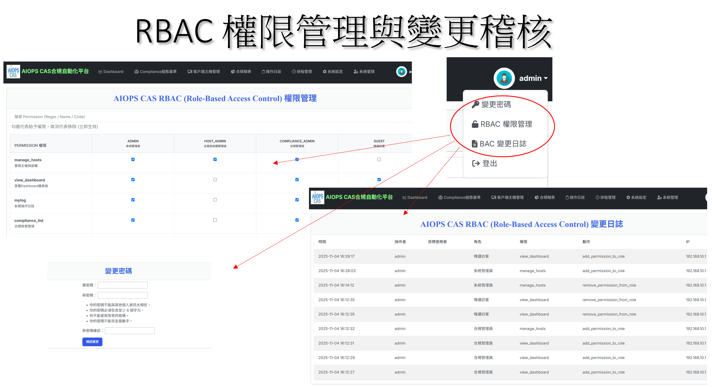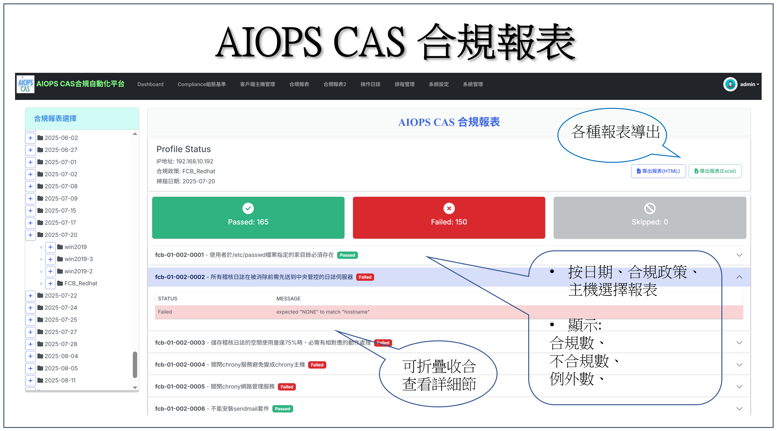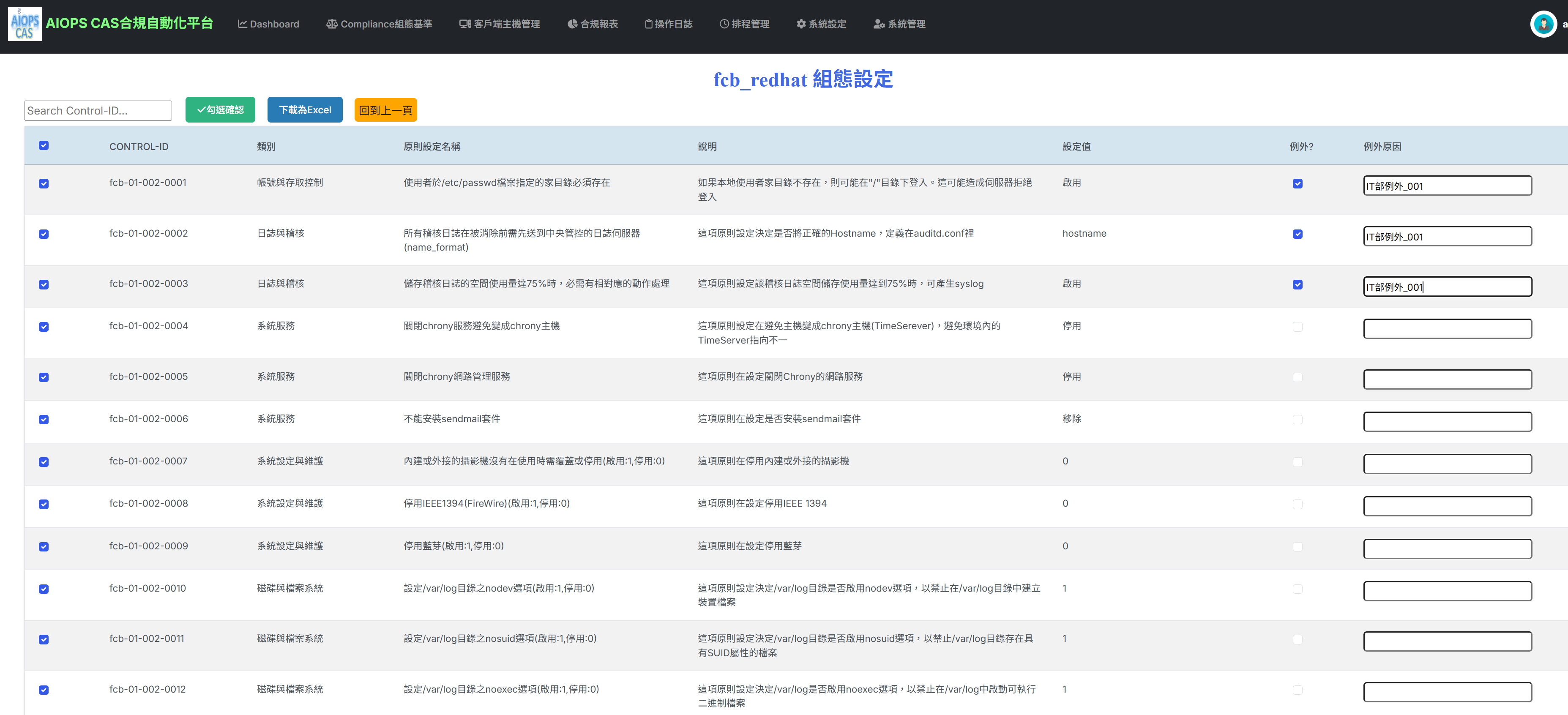 AIOPS CAS 合規自動化系統,提供全系統平台組態設定檢核與修正套用功能。